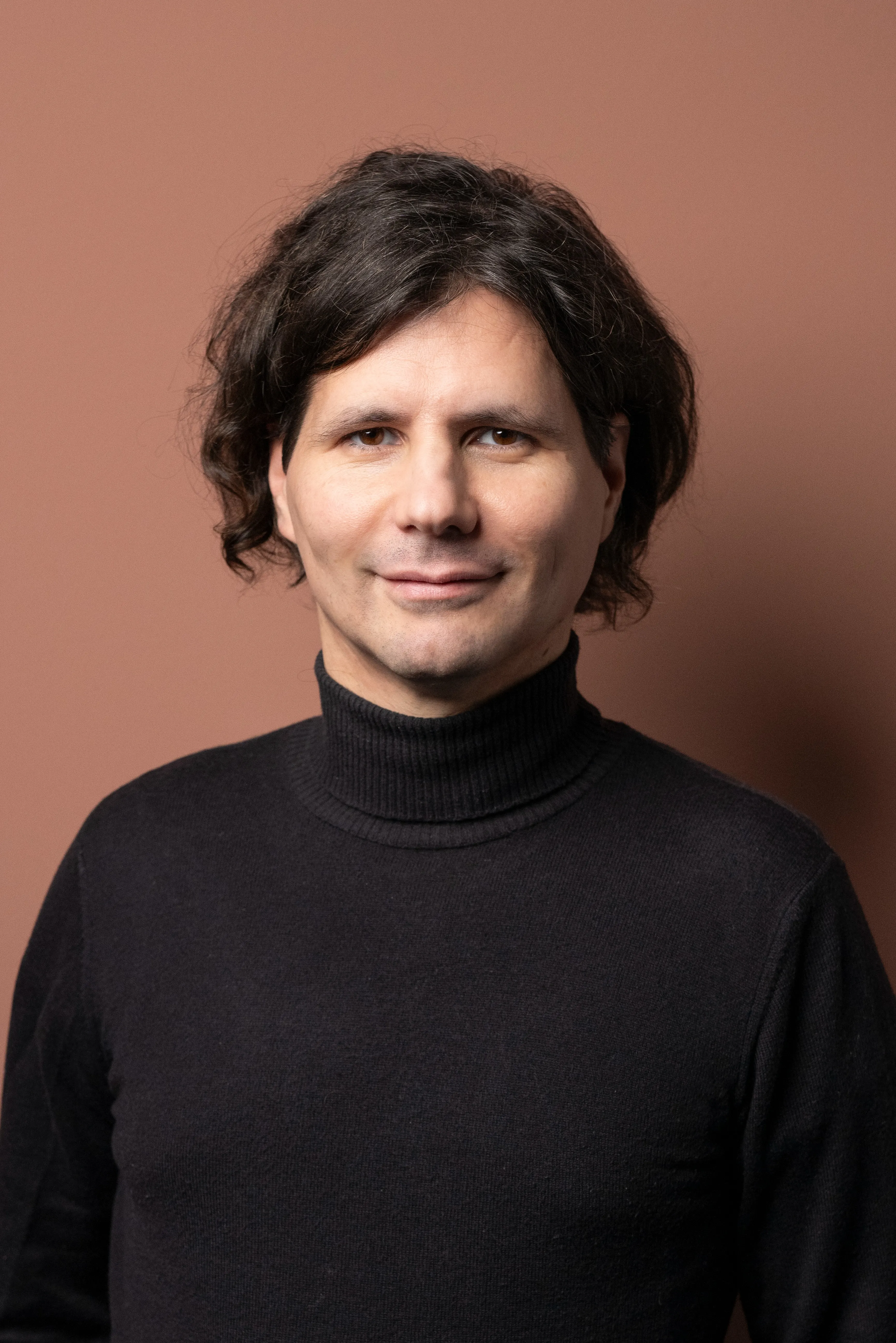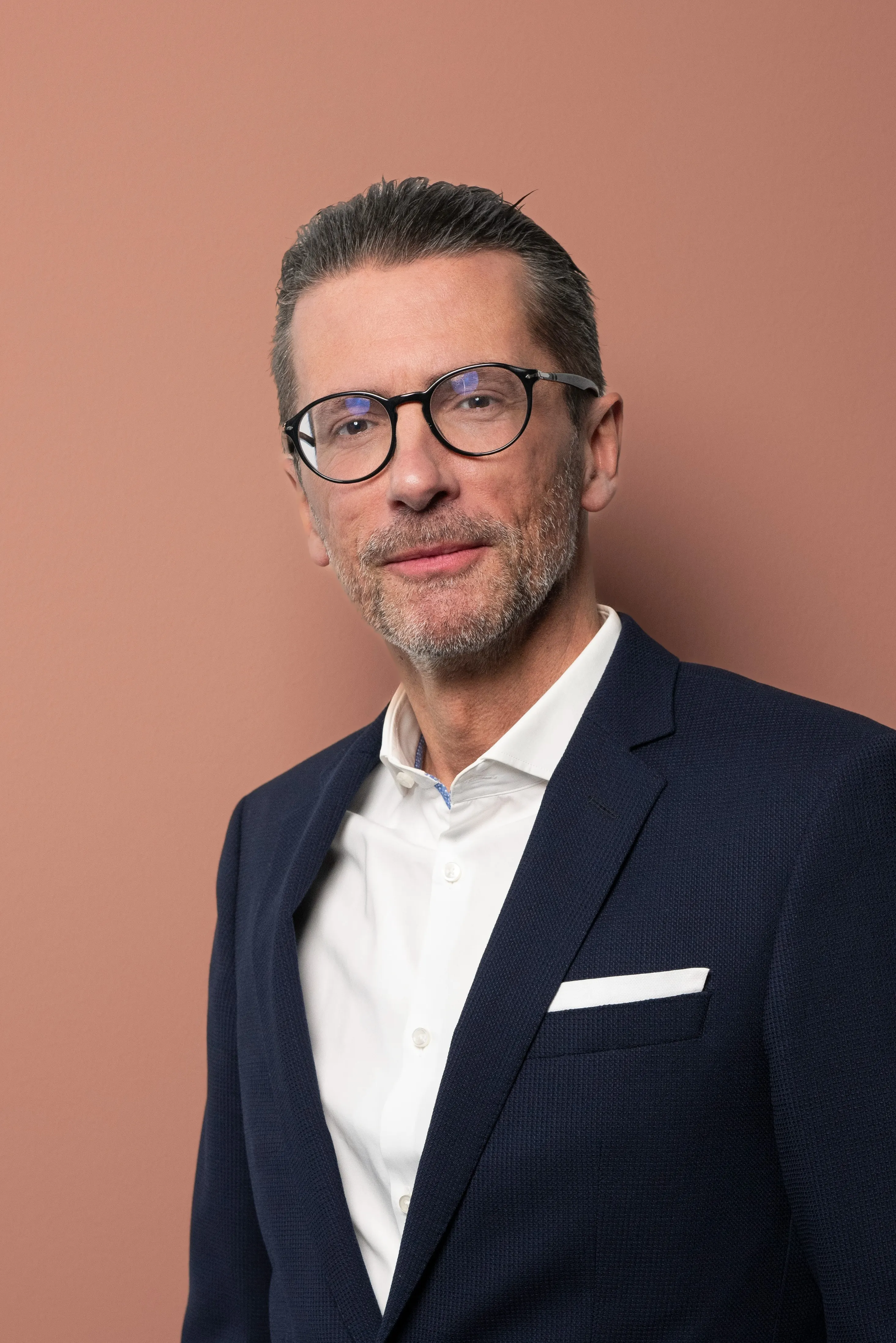 Eleganter reifer Mann mit Brille und Bart im dunklen Anzug vor rosafarbenem Hintergrund.