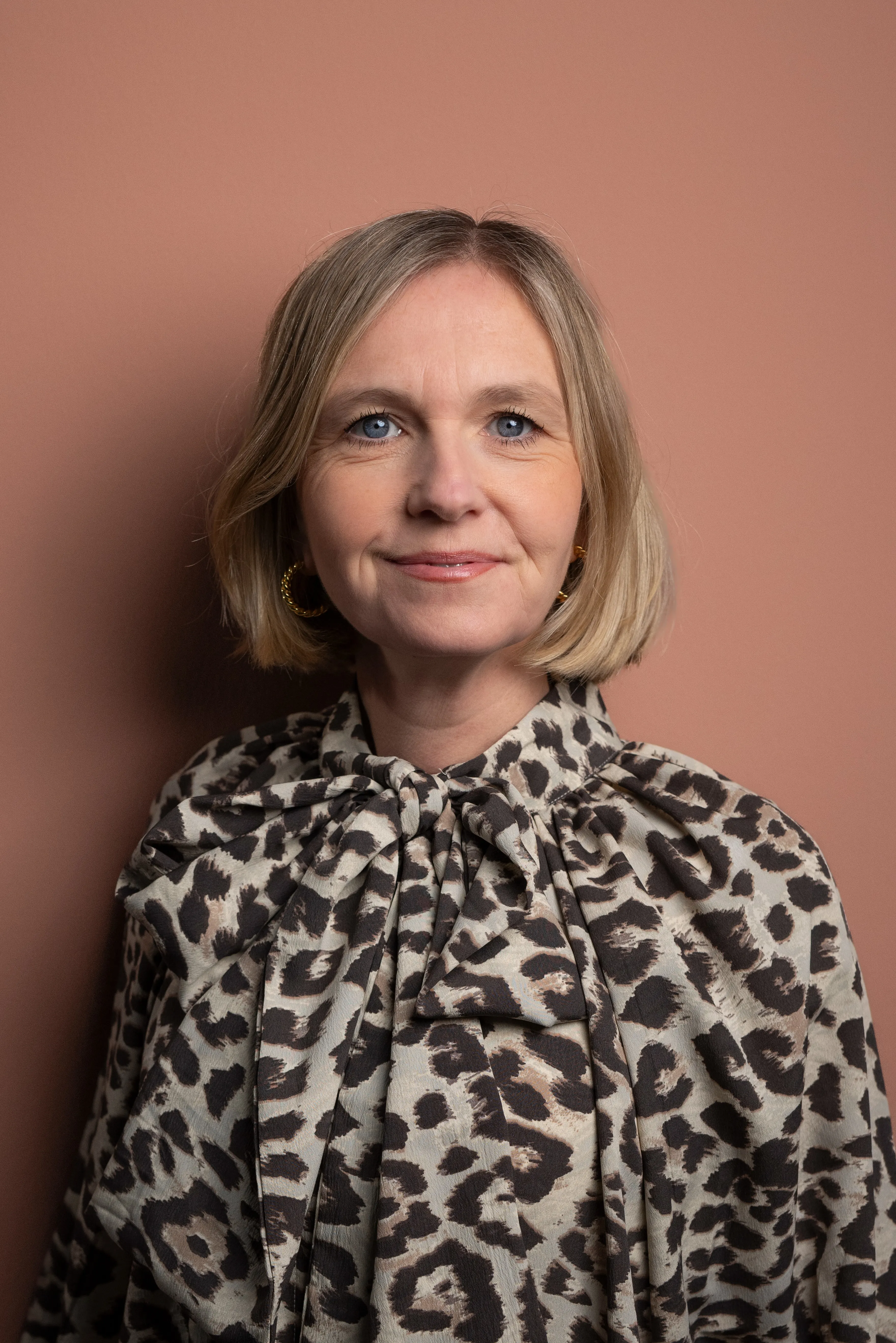 Eine blonde Frau mittleren Alters lächelt vor einem rosa Hintergrund. Sie trägt eine leopardengemusterte Bluse.